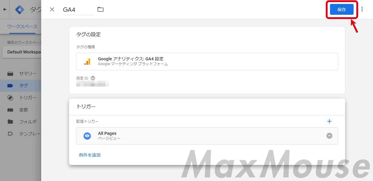 タグ一覧で[新規]をクリックしたのち、タグ名・タグ設定・トリガーを指定して保存すると、GA4のページビュー取得タグが設定できます。